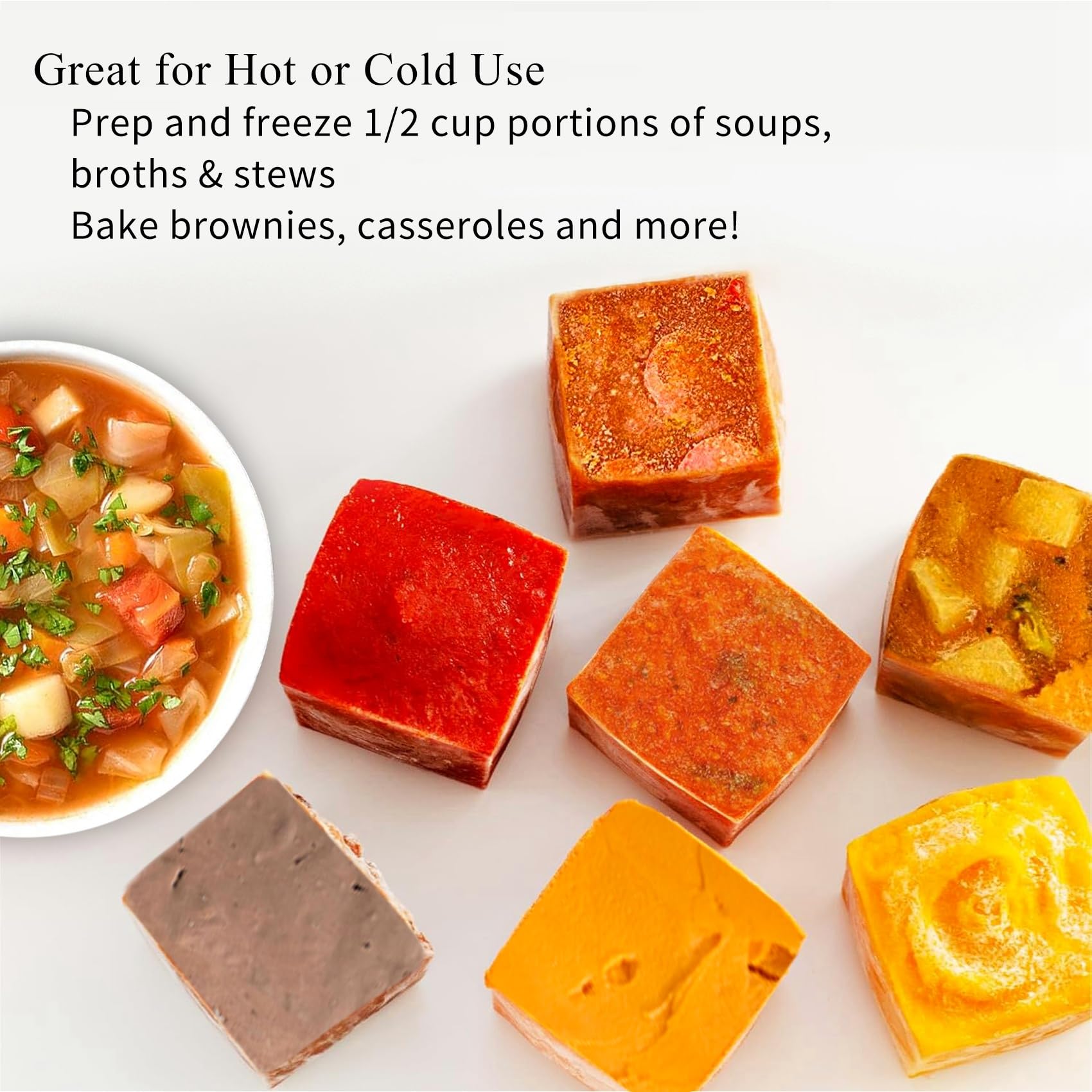 - REUSABLE CONTAINERS WITH MORE POSSIBILITIES - from ice cubes to baby food, soup, sauce, curry, porridge, or frozen desserts, these freezer containers for soup reusable have wide application capabilities; You can conveniently store and freeze different types of ingredients; The practicality of these trays is evident in their versatility, serving a range of your needs; Make kitchen tasks more manageable with these trays