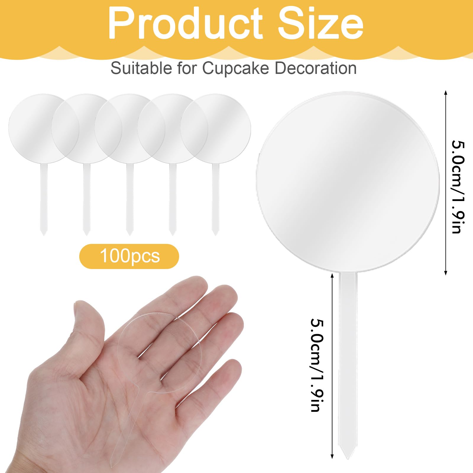 - Bulk Quantity: you will receive 100 pieces round acrylic cupcake toppers with sticks, each measures 2 inches/ 5 cm in diameter, 0.06 inches/ 1.5 mm in thickness; Abundant quantity can meet your assorted parties DIY demands and you can also share them with others