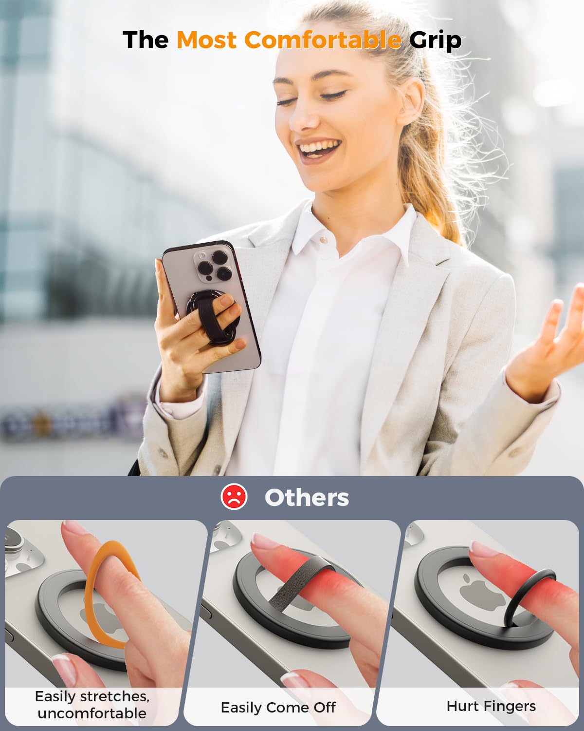 - [๐ ๐ผ๐ฟ๐ฒ ๐๐ผ๐บ๐ณ๐ผ๐ฟ๐๐ฎ๐ฏ๐น๐ฒ ๐๐ฟ๐ถ๐ฝ] Equipped with a adjustable soft Velcro adjustment strap, the tightness of the strap can be flexibly adjusted based on your fingers, providing a more comfortable and secure grip as an iphone ring grip. Unlike metal rings, it won't make your fingers feel uncomfortable when holding your phone.