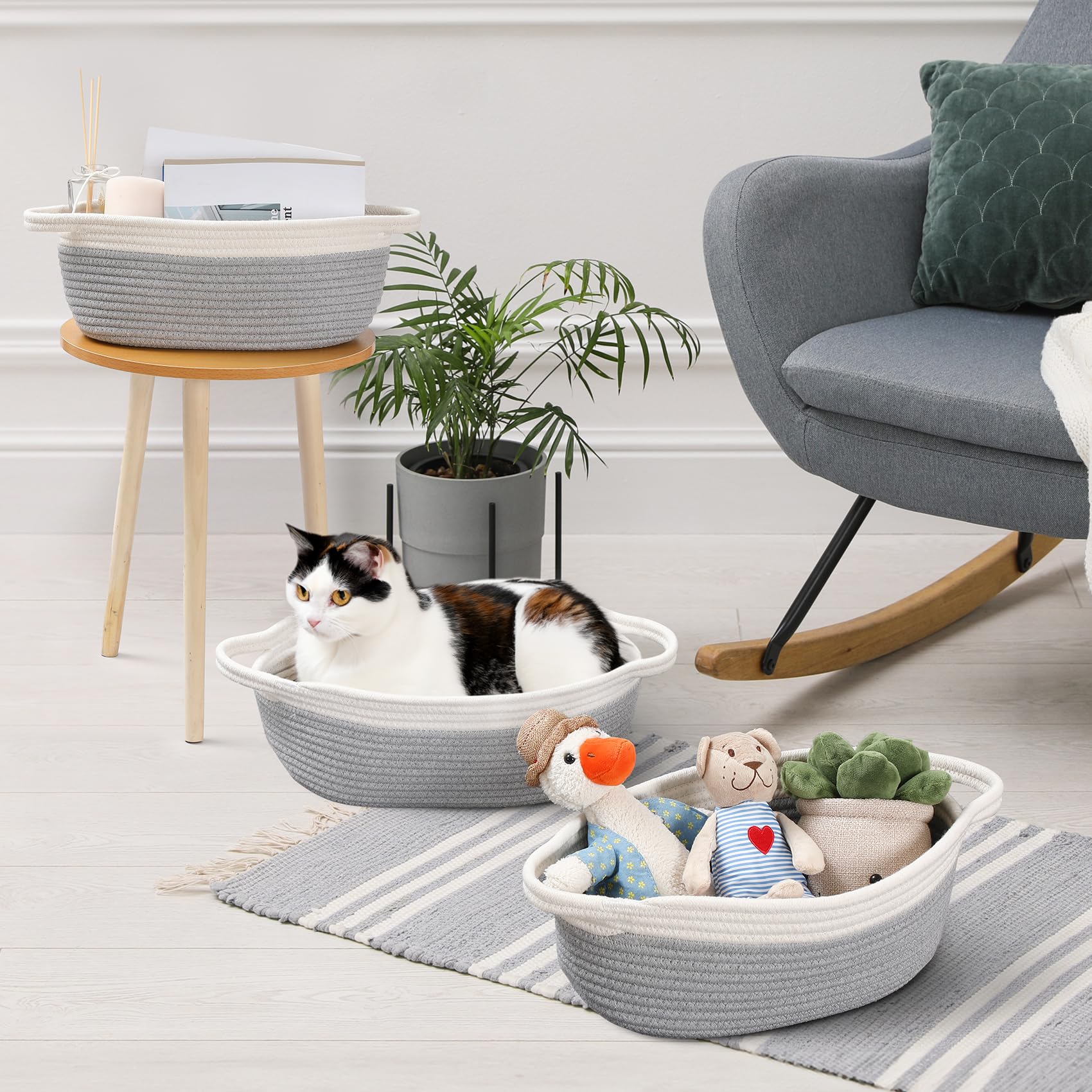 4 Pack Small Woven Basket with Handles, Cotton Rope Room Shelf Storage Basket, Cute Baby Gift Basket for Nursery, Bedroom - Cat Dog Toys Basket, Empty Decorative Gift Chest Box, All 12"x 8"x 5",Grey