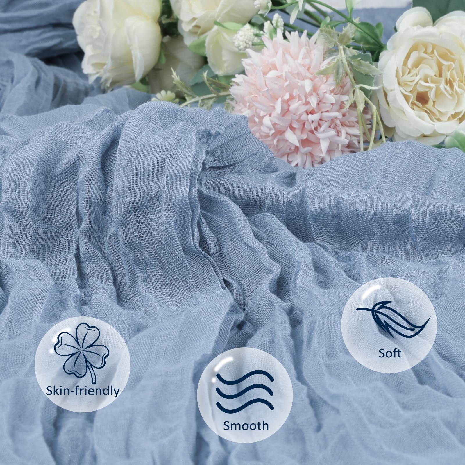 - 【Gorgeous Looking】Our Cheese Cloth Table Runner Are Meticulously Crafted From High Polyester Fabric, With Fine And Dense Texture. Not Only Do They Feel Skin-Friendly, Smooth And Soft When Touched, But Also Present An Elegant Appearance Visually, Our Gauze Table Runner Is Truly An Excellent Decoration For Your Table.