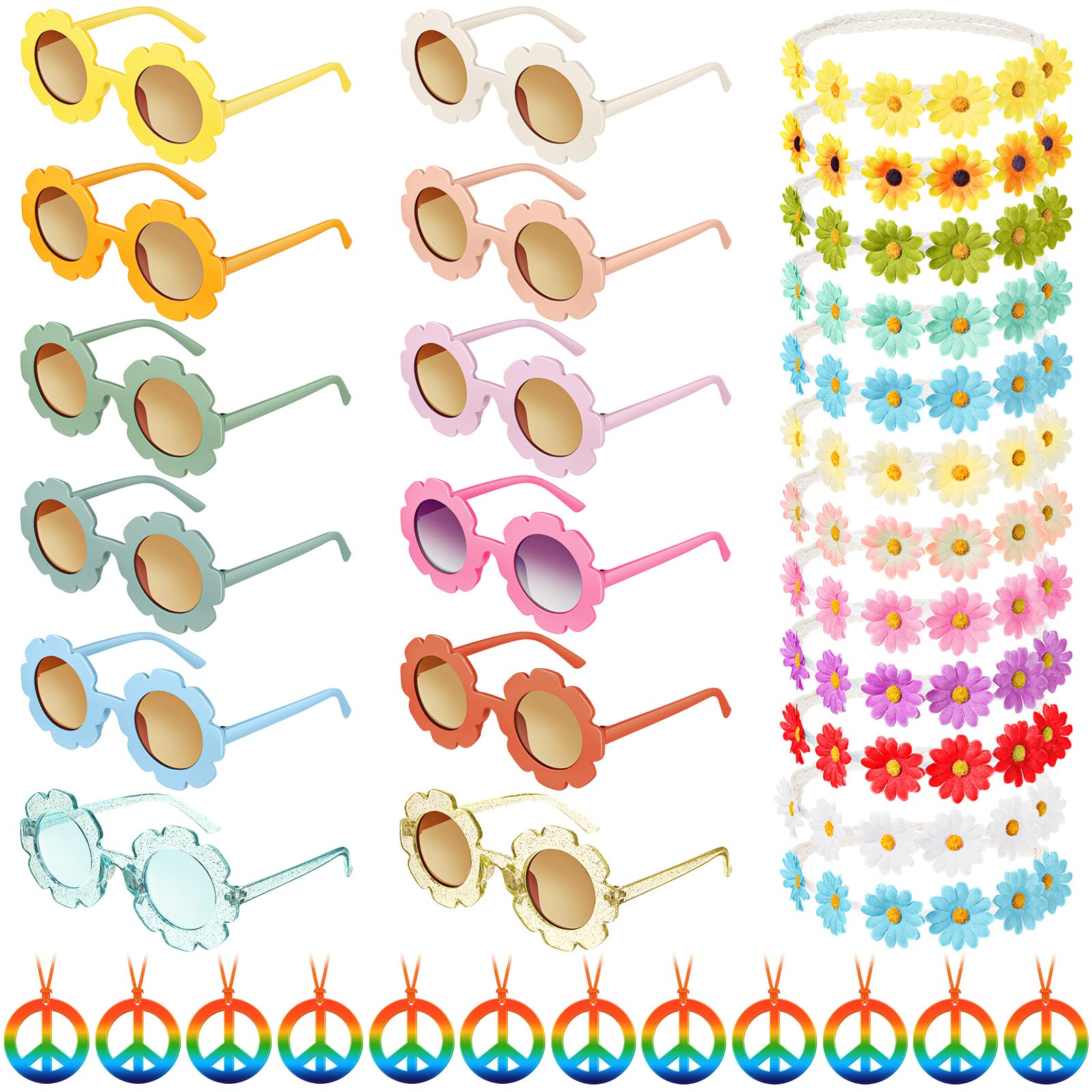- Groovy Party Favors Set: you will receive 12 pieces of hippie glasses, 12 pieces of dasiy sunflower headbands and 12 pieces of peace sign necklaces; Sufficient quantity and colors meet your daily uses and match, and you can share them with your buddies