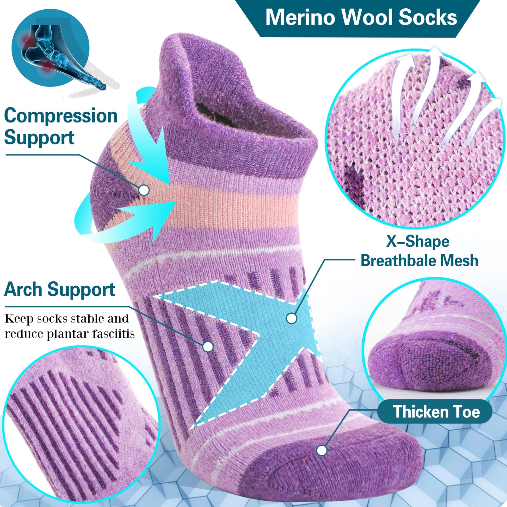 - COMPRESSION SUPPORT- Targeted compression stripes can protect your achilles and reduce plantar fasciitis. High elastic fabric can enhance the blood moving, relieve symptoms varicose and keep socks stable. Anti abrasion tab prevents socks from slipping. These merino wool socks can greatly improve your comfort in hiking, running, walking, climbing, trekking or everyday wear.