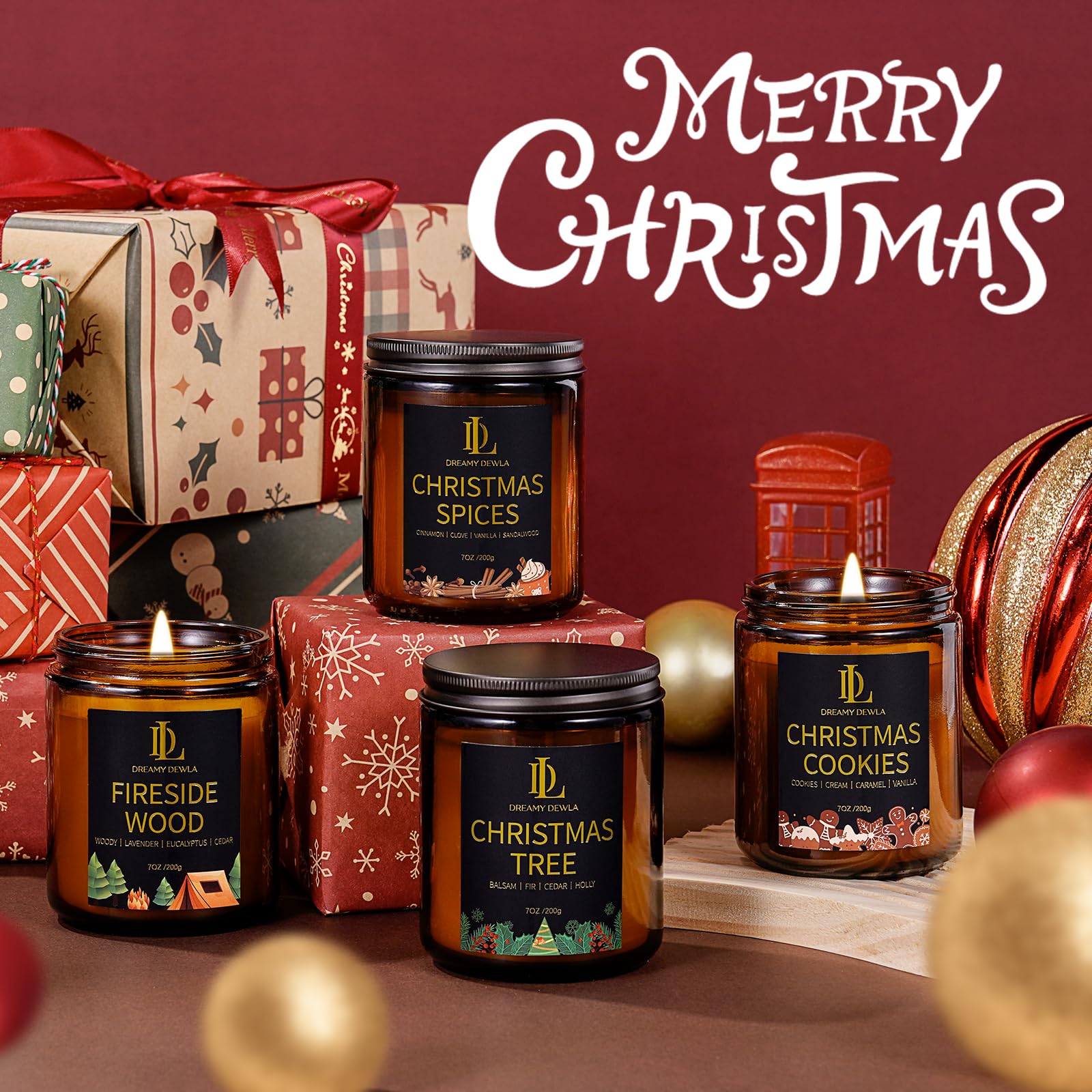- 4 Pack Christmas Candle Set: Our Christmas candle set features a selection of 4 festive scent combinations, Christmas Tree, Christmas Cookies, Christmas Spices, and Fireside Wood Scent. Each scented candle brings colorfulness to your life during the Christmas season and creates a warm Christmas atmosphere in every moment.