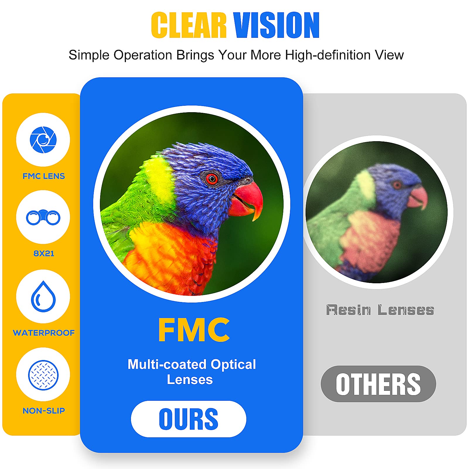 - Shock Proof: Enduring binoculars that can withstand drops and falls on floors due to rubber coating that absorbs shock. If accidentally dropped on the ground, the binoculars are protected from damage with shock proof rubber armor. Other brands do not have this safety feature