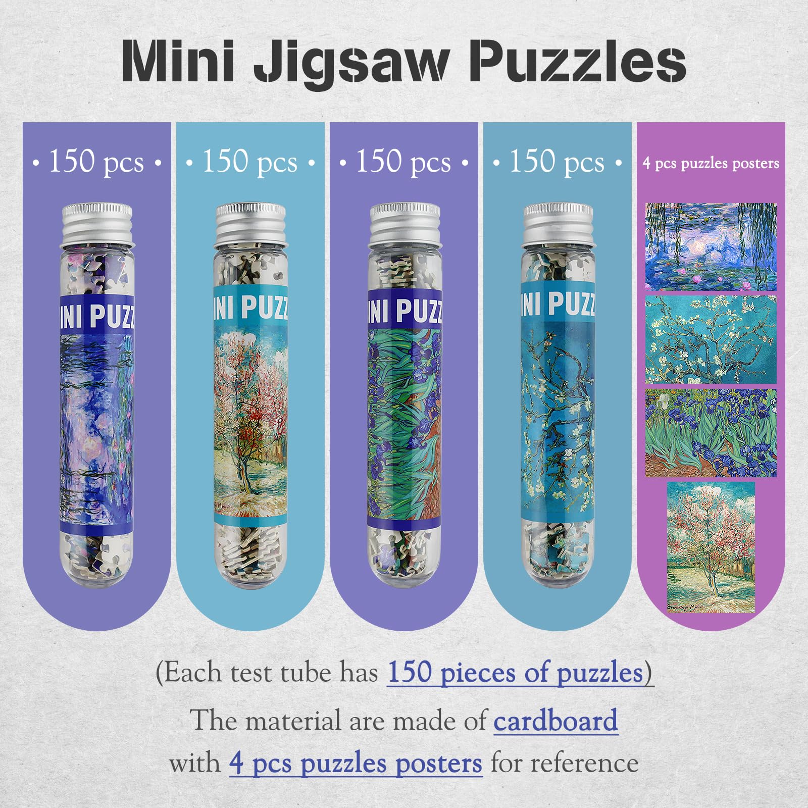 - Jigsaw puzzles 150 pieces -- puzzles for adults are include 4 pcs separate test tube packaging, each puzzle with 150 pieces. Each pieces puzzles smaller than your finger. This set of jigsaw puzzle completed size: 6 x 4 in/15 x 10 cm (Not including frame).