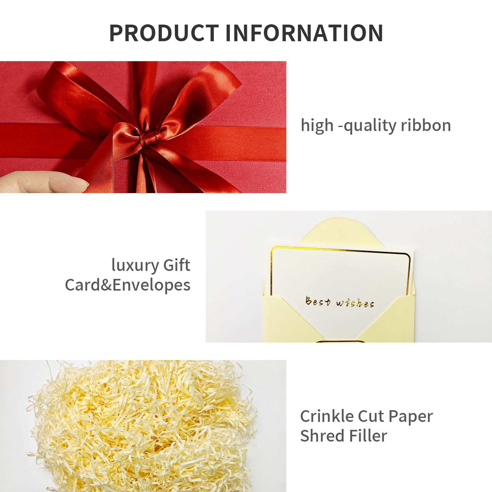 • 【Package Includes】1*Premium Red Gift Box,1*Blank Gift Card Set,1*Roll Satin Luxury Ribbon(118inch ),1*Pack of shredded filler.everything you need for a beautifully wrapped gift.Please verify the size before purchasing to ensure it meets your needs.